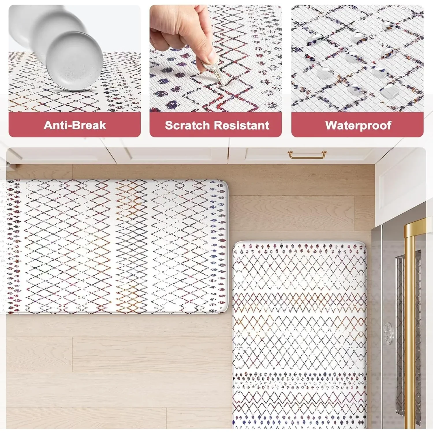 - Comfort Anti-fatigue Kitchen Mats: 0.47inch (12mm) extra thick anti fatigue kitchen floor mat are sure to provide cushion on your feet, knees, lower back, and joints for standing.Feel comfortable like walking on a firm but soft cloud when you are cooking in kitchen or working at your standing desk