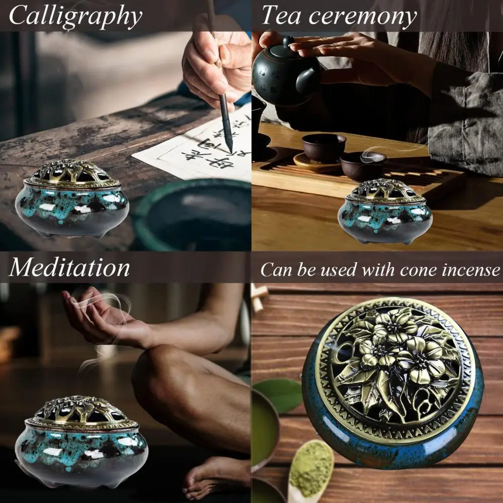 Incense Burner with Lid Hollow Top Slow Smoke Fireproof Heat Resistance Ice Crack Pattern Peaceful Mind Censer Burner Living Room Supply